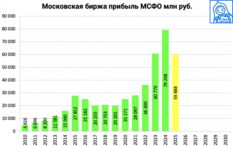 По его прогнозам, "Мосбиржа" может направить на дивиденды 60% чистой прибыли (по итогам 2024 года было 75%), что соответствует 15,6 рубля на акцию.